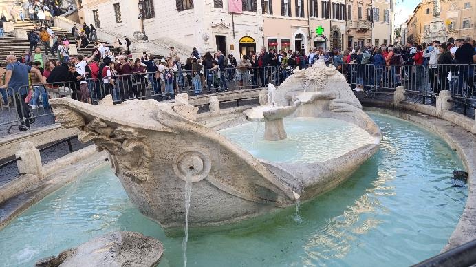 En medio de la plaza, a los pies de la escalera, está la Fontana della Barcaccia de Pietro Bernini. Una de las fontanas más bellas de Roma.